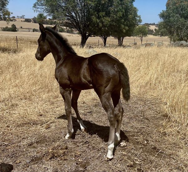 Tina has a lovely inquisitive nature and has a trainable disposition. She has started halter training and leading, she has been hauled and handled. Tina will mature around 14.3-15 hands, good conformation, big hip and strong.She will excel in cow horse events like campdraft, roping, team penning, bred versatile with speed she will also be competitive in timed events.